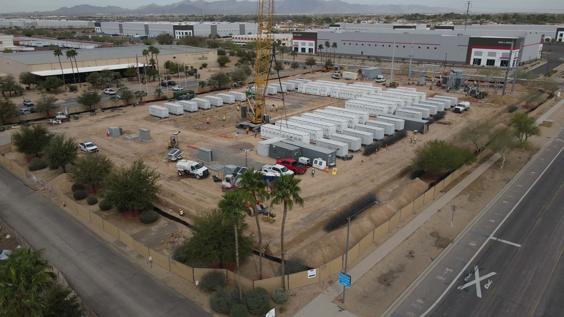 Prism Masonry provided commercial masonry services in Goodyear, AZ, for the Pluto Battery Energy Storage System (B.E.S.S.), constructing a 12-inch CMU sound wall with integral CMU and decorative pre-cast panels. The project spanned 1,420 linear feet and reached 18 feet in height, delivering a durable and aesthetically refined barrier for the energy facility.