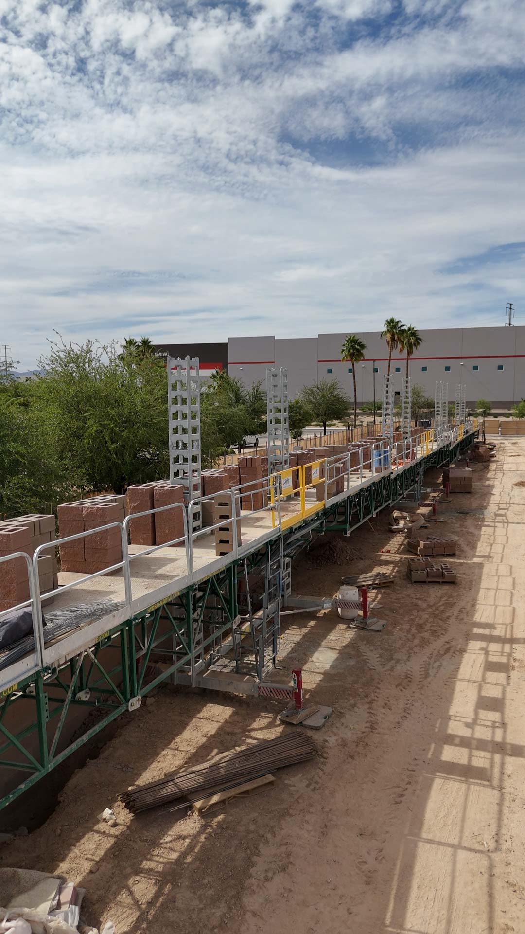 Our team executed full-site work, including excavation, footing installation, materials testing, and geotechnical compliance. Using Hydromobile hydraulic lift scaffolding, Prism Masonry erected the sound wall efficiently, completing the project in just 60 working days—two months ahead of schedule. The combination of structural CMU and decorative pre-cast elements provided both functionality and visual appeal, meeting the client’s high standards for quality and accelerated timelines.